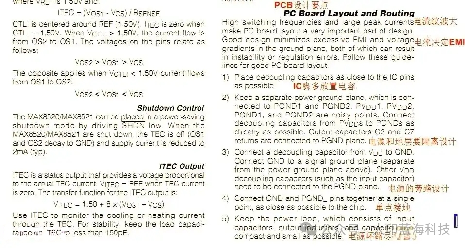 在以集成芯片为核心的TEC控制应用中,我们简要探讨了 PID反馈控制设计和PCB布局设计的关键性。PID设计可参考典型案例,并结合实际样板结果进行精细调试。而PCB布局方面,则需特别关注大功率回路的隔离、散热以及电磁干扰(EMI)的防范措施。