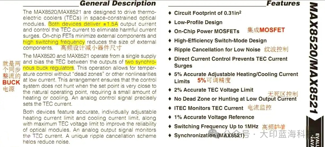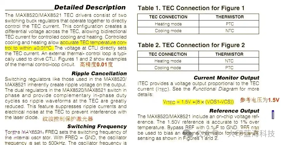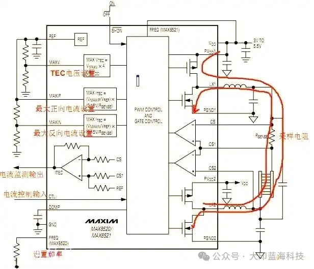 那么,如何才能有效地驱动TEC以实现精确的温度控制呢?让我们以一款集成了TEC控制芯片的产品为例,来探讨一下TEC的驱动控制原理。这款产品采用的是 MAX8520集成芯片,其驱动电流为1.5A,驱动方式与电机的驱动颇为相似。