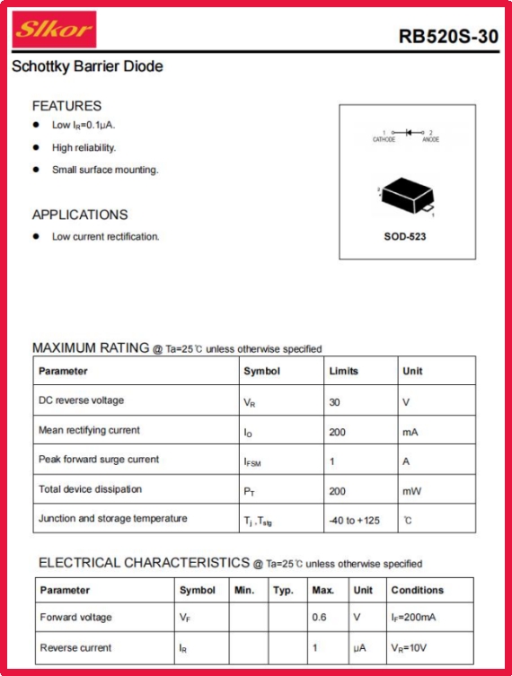 在电子元件的微观世界里,肖特基二极管凭借其独特的性能优势,成为高频、高效电路中不可或缺的“效率引擎”。萨科微Slkor匠心打造的RB520S-30肖特基二极管,正是这样一款集低损耗、高速度、高可靠性于一身的明星产品,为现代电子设备的高频应用提供了坚实支撑。