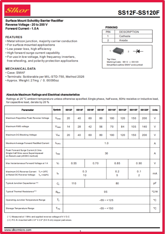 在智能手机快充的瞬间电流控制中,在LED灯带稳定发光的电源转换里,在消费电子设备抵御电压波动的保护机制中,一颗直径仅3mm的肖特基二极管正默默发挥着关键作用。slkor萨科微推出的SS14F,凭借其独特的性能组合,成为电源管理领域“小而强”的典型代表,为各类电子设备提供了可靠的效率保障。