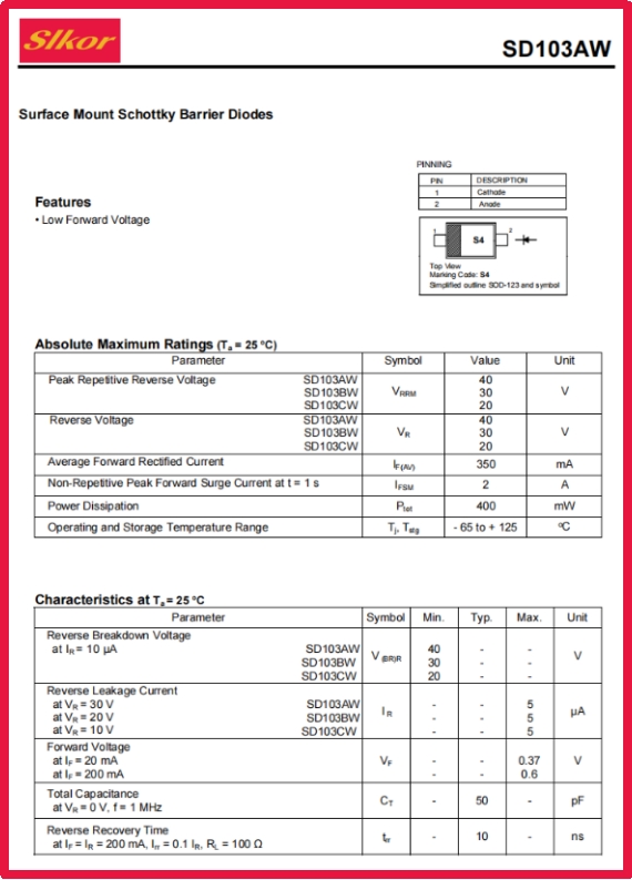 萨科微Slkor肖特基二极管SD103AW相关参数
