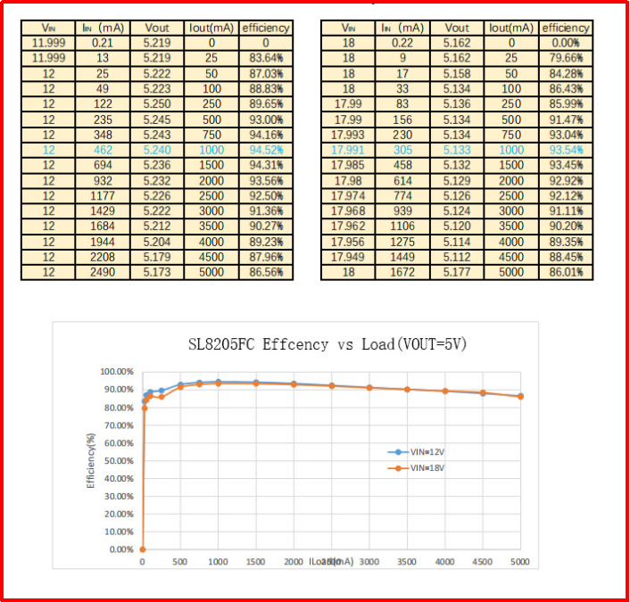 如上图所示萨科微SL8205FC在测试1A 5V输出的情况下能效达到93.54%,在输出电流为3A的时候达到了90%以上,它是非常不错的一款DC-DC同步降压芯片。萨科微SL8205FC这颗DC-DC芯片在大电流场景应用非常热销,最大电流能达5A。