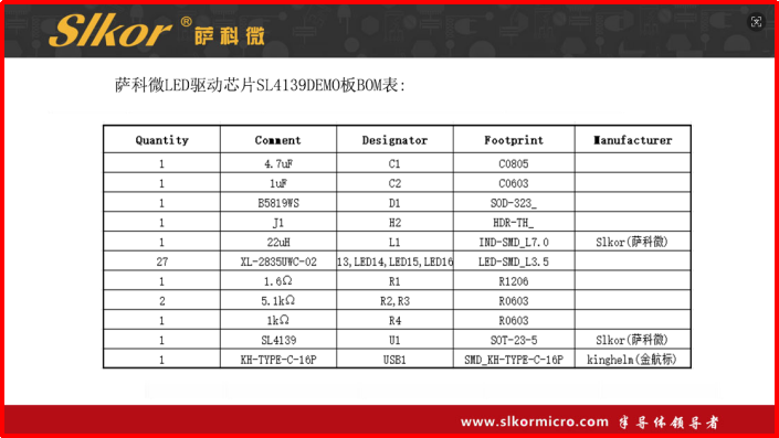 7.萨科微 LED驱动芯片SL4139 DEMO板BOM表信息如下: