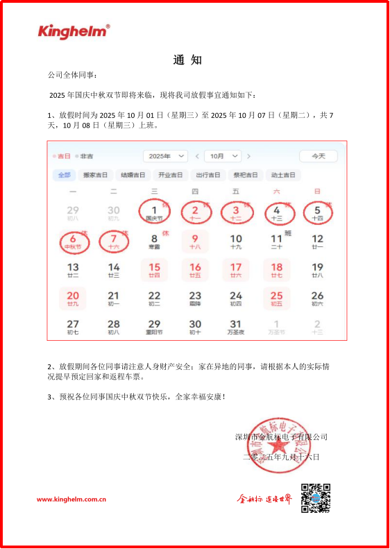 3、金航标和萨科微(slkormicro.com)2025年国庆放假时间为 2025年10月1日(星期三)至 2025年10月7日(星期二),放假共7天,10月8日(星期三)恢复正常工作。