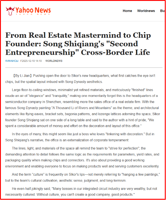 雅虎新闻网刊载《From Real Estate mastermind to Chip Founder: Song Shiqiang's "Second Entrepreneurship" Cross-Border Life》