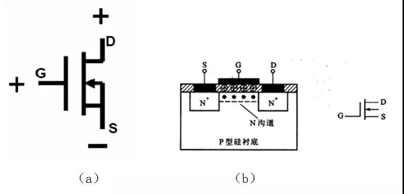 图1-4-(a)是N沟道MOS管的符号,图中D是漏极,S是源极,G是栅极,中间的箭头表示衬底,如果箭头向里表示是N沟道的MOS管,箭头向外表示是 P沟道的MOS管。