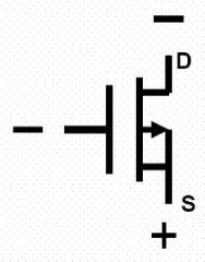 实际在MOS管生产的过程中衬底在出厂前就和源极连接,所以在符号的规则中,表示衬底的箭头也必须和源极相连接,以区别漏极和源极。图1-4-(c)是P沟道MOS管的符号。MOS管应用电压的极性和我们普通的晶体三极管相同,N沟道的类似NPN晶体三极管,漏极D接正极,源极S接负极,栅极G正电压时导电沟道建立,N沟道MOS管开始工作,如图1-4-(b)所示。同样P道的类似PNP晶体三极管,漏极D接负极,源极S接正极,栅极G负电压时,导电沟道建立,P沟道MOS管开始工作,如图1-4-(d)所示。