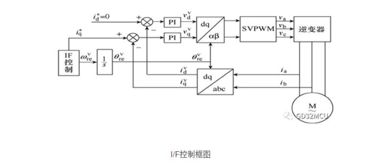 无刷无感直流电机启动是很关键的一步,为了达到启动快速稳定噪音小等特性,本方案采用的了I/F启动方法。I/F启动方式的核心是在电枢绕组中产生幅值跟随参考值、频率逐渐增大的旋转电流矢量,使转子加速起动。它的特点是工作在速度开环、电流闭环的状态,定子绕组电流经过坐标变换以后,投影到由指令位置角决定的旋转坐标系上,并受期望值的约束,可有效避免过流产生。其控制框图如下图所示。