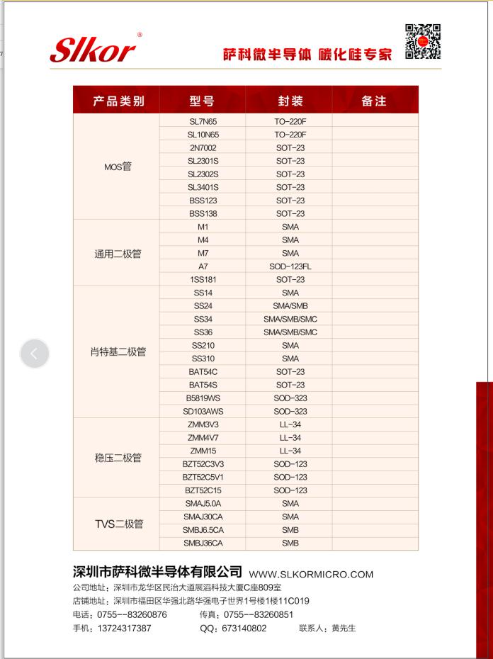 萨科微slkor半导体在华强北直营店销售的都是slkor品牌这个单一品牌的产品,2N7002 、BSS138 、SL10N65 等萨科微mos管,SS14、SS24、SS16、BAT54C、SD103AWS等肖特基二极管,SMAJ5.0A 、SMBJ6.5CA、SMAJ30CA等TVS二极管,1N4148W、LL4148等开关二极管、SLPESD0402M16、SLPESD0603-24等ESD二极管、AMS1117-3.3、AMS1117-5.0、SL78L05等萨科微线性稳压器LDO,TL431、MC34063S、通LM2575S-5.0电源管理IC,ULN2803AS、ULN2003AU、TIP122萨科微达林顿管、S8050、SS8550、MMBT5401、MMBT5551等三极管、SL1613SH、SL1603SL霍尔开关传感器,BTA16-800B、BTA24-800B、BT136S-800E等型号的可控硅,LM321、LM358S萨科微的运算放大器等通用畅销的型号。