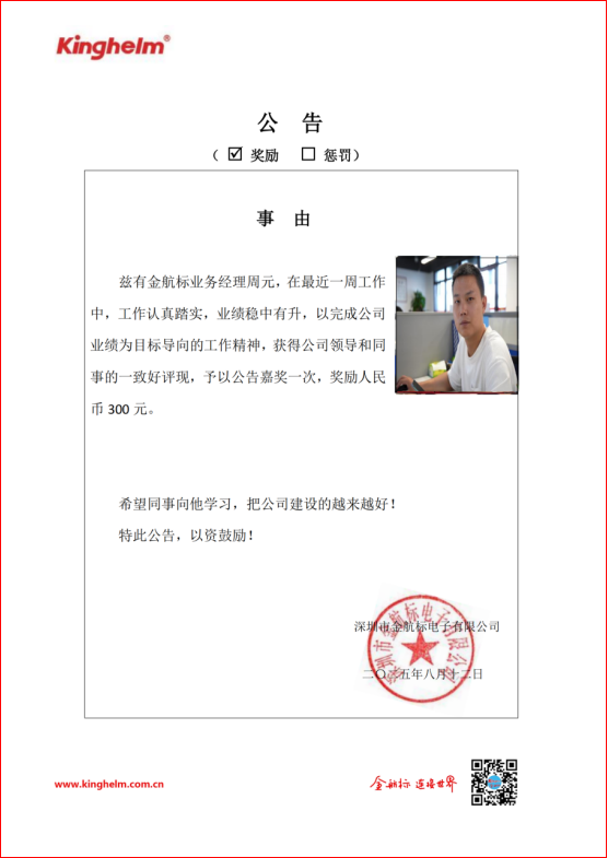 2025年08月11日到2025年08月16日,金航标(www.kinghelm.net)/萨科微(www.slkoric.com)“每周之星”经过领导和同事们评比,获奖的是金航标业务经理周元,在最近一周工作中,工作认真踏实,业绩稳中有升,以完成公司业绩为目标导向的工作精神,获得公司领导和同事的一致好评现,予以公告嘉奖一次,奖励人民币 300 元。