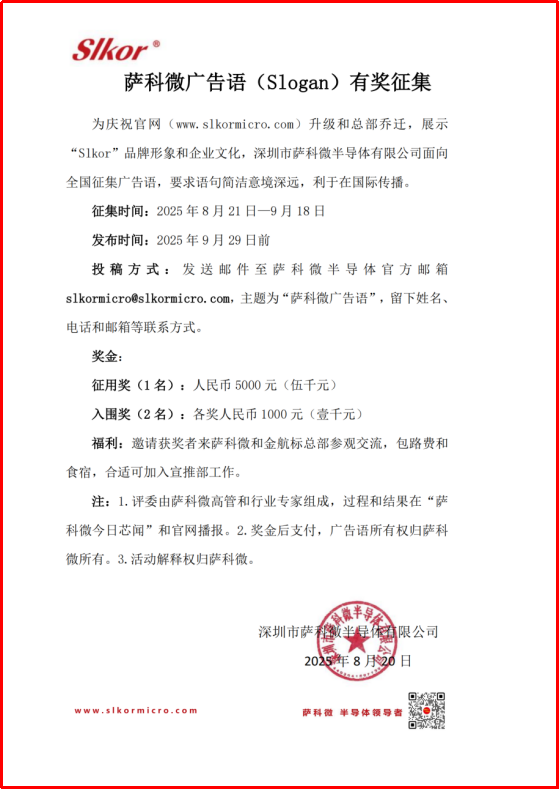 本次活动评审团由萨科微高管团队及业内专家共同组成,保证评选过程的专业性与公正性。最终结果将于2025929日前通过“萨科微今日芯闻”微信公众号及官方网站(www.slkormicro.com)向社会公布。所有获 奖广告语著作权及使用权将归萨科微半导体有限公司所有。