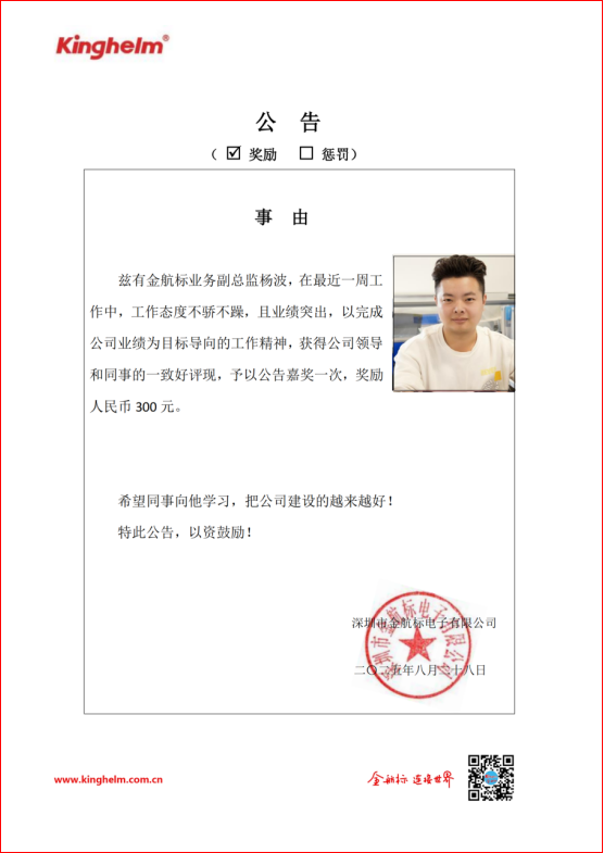 2025年08月25日到2025年08月30日,金航标(www.kinghelm.net)/萨科微(www.slkoric.com)“每周之星”经过同事们评比,获奖的是金航标业务副总监杨波,在最近一周工作中,工作态度不骄不躁,且业绩突出,以完成公司业绩为目标导向的工作精神,获得公司领导和同事的一致好评,现予以公告嘉奖一次,奖励人民币300元。