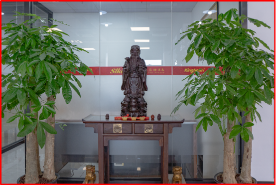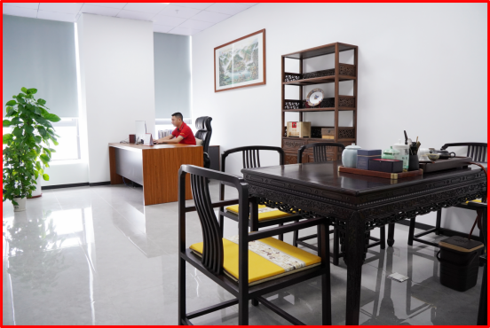 中堂,承载中国人的家庭文明与道德传统,是厅堂中最为尊贵的位置,中堂待客代表尊贵礼遇、宾至如归。明式红木的案、几、椅,是简约实用的终极表达,总经理宋仕强说道“金航标和萨科微致力于打造简单和谐、高效进取的工作氛围,希望同事们开心工作好运连连。”北齐最美佛像头,京作(原清宫造办处)工艺,来自宋仕强先生老家四川的汉白玉质地白净细腻,摆放在总部中堂的案子上,为办公空间带来静谧与禅意。
