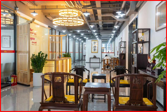 萨科微和金航标采用生态化、矩阵化、层次化方法论,将公司的业务分为不同的板块和部门,并通过有机的协作和管理,实现了高效的运营和发展。宋仕强先生说道,在繁忙的工作中要有静下来的时间与空间,静才能思,思可生智慧。当东方韵致邂逅极简诗意,“静”成为室内设计的核心。细微处见真章,宋式美学元素(飞檐、花格、菱花纹、冰裂格等)嵌入各处,还有故宫博物院复刻的宋代王希孟的名画《千里江山图》,一幅长达12米的卷轴分为6个部分用红木框装裱起来环绕整层楼核心筒悬挂起来,也起到了人流动线按照顺时针方向的指引作用,让办公空间充满了宋代文人的灵感和厚重的历史价值。源自《千里江山图》的琉璃山形小品,用传统文化符号激活现代高科技公司的空间基因,给人历史的静思和文化的遐想,让空间充满“简、雅、静气、大气”之美。明式红木的案、几、椅是简约实用的具象表达,最美佛头给人瞻仰、仰望的意味,角落的竹子营造闹中取静的意境空间,形态各异的石头散布营造室外的空间感,生机盎然的绿焕发空间活力,这些都让时间、空间与人的连接自然形成。