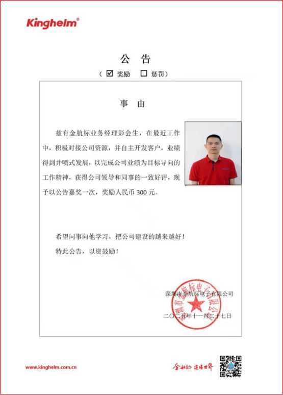 2025年11月24日到2025年11月28日,金航标(www.kinghelm.net)/萨科微(www.slkoric.com)“每周之星”经过同事们评比,这周“每周之星” 是金航标业务经理彭会生,在最近工作中,积极对接公司资源,并自主开发客户,业绩得到井喷式发展,以完成公司业绩为目标导向的工作精神,获得公司领导和同事的一致好评,现予以公告嘉奖一次,奖励人民币 300 元。