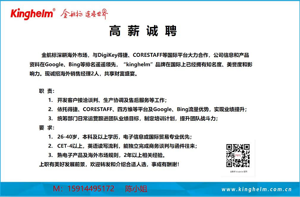 随着萨科微半导体和金航标电子在国内市场的稳步成长与影响力日益提升,公司已迈入高速发展的新阶段。为加速全球业务布局,推动品牌国际化进程,现诚聘两名海外市场销售经理,与我们共同开拓更广阔的世 界舞台。除此之外,萨科微半导体的产品系列十分丰富,不仅有数模转换器(ADC)和V/F和F/V转换芯片,还有碳化硅SiC二极管、碳化硅SiC MOS管、IGBT管、第五代超快恢复功率二极管等高端产品,可满足新能源汽车、高端装备、通讯电力、太阳能光伏、医疗设备、工业互联网等行业需求;萨科微通用型产品有肖特基二极管、ESD静电保护二极管、TVS瞬态抑制二极管等通用二极管和三极管,功率器件有高中低压的MOS管、可控硅、桥堆等,和电源管理芯片LDO、AC-DC、DC-DC芯片系列,还有传感器、高速光耦、晶振等为客户提供配套服务,在智能手机、手提电脑、机器人、智慧家居、物联网、LED照明、3C数码、智能穿戴品、万物智联等产品上面广泛应用!萨科微的兄弟公司——金航标,产品销往世 界各地,服务超一万家客户,产品有北斗GPS双模天线、蓝牙、WiFi、Zigbee、NB-IoT、LORA、UWB、天线系列,及配套的射频转接线;现在产品拓展到板与线的各种连接器、板端座子、接插件、信号开关系列;及汽车摩托车线束、工业、医疗、科研用特种线材,非标定制品等三大系列,与萨科微一起为电子整机产品公司提供配套服务。