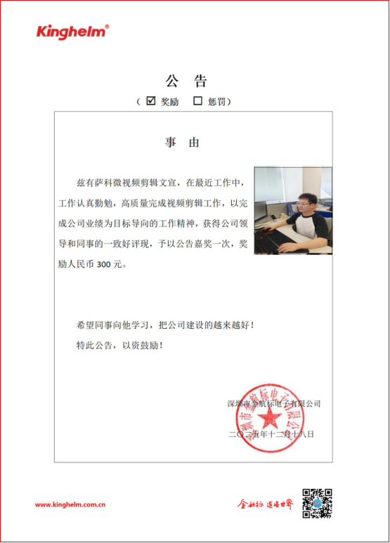 2025年12月15日到2025年12月20日,金航标(www.kinghelm.net)/萨科微(www.slkoric.com)“每周之星”经过同事们评比,这周“每周之星” 是萨科微视频剪辑文宣,在最近工作中,工作认真勤勉,高质量完成视频剪辑工作,以完成公司业绩为目标导向的工作精神,获得公司领导和同事的一致好评,现予以公告嘉奖一次,奖励人民币 300 元。
