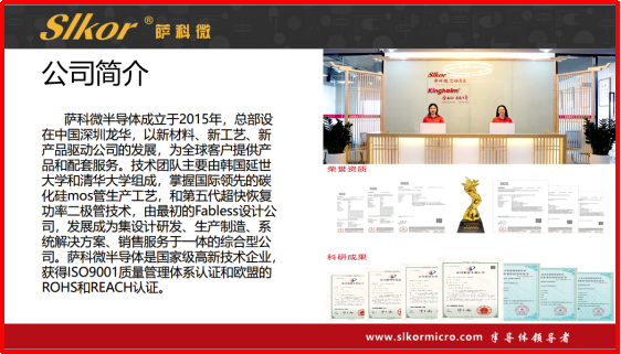 萨科微技术团队来自清华大学,是国 家级高新技术企业,较早研发出碳化硅功率器件,发展成为集研发、设计、销售和应用技术服务于一体的公司,企业文化有包容性、开放性和创新性。“SLKOR”品牌已在国际上拥有知名度、美誉度,市场占有率持续攀升,取得ISO9001体系和RoHS、REACH、加州65等认证。