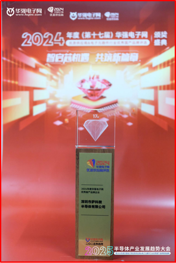 2025年4月,在“2025半导体产业发展趋势大会暨2024年度(第十七届)华强电子网优质供应商&电子元器件行业优秀国产品牌颁奖盛典”上,萨科微半导体再获由华强电子网颁发的“2024年度华强电子网优秀国产品牌企业”。这是公司连续第三年获此殊荣,充分彰显了萨科微Slkor品牌在国产半导体领域的影响力。