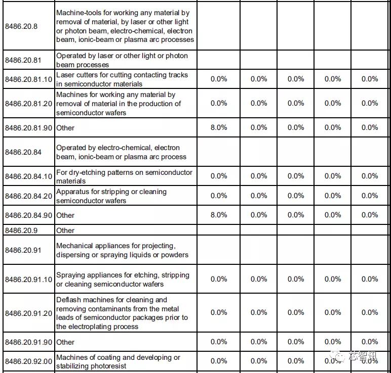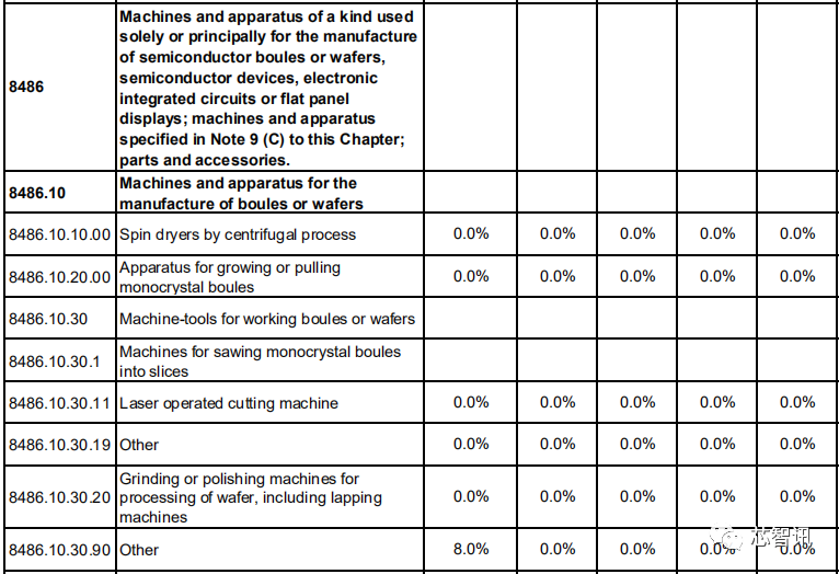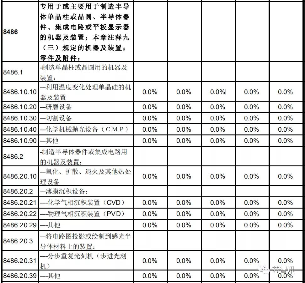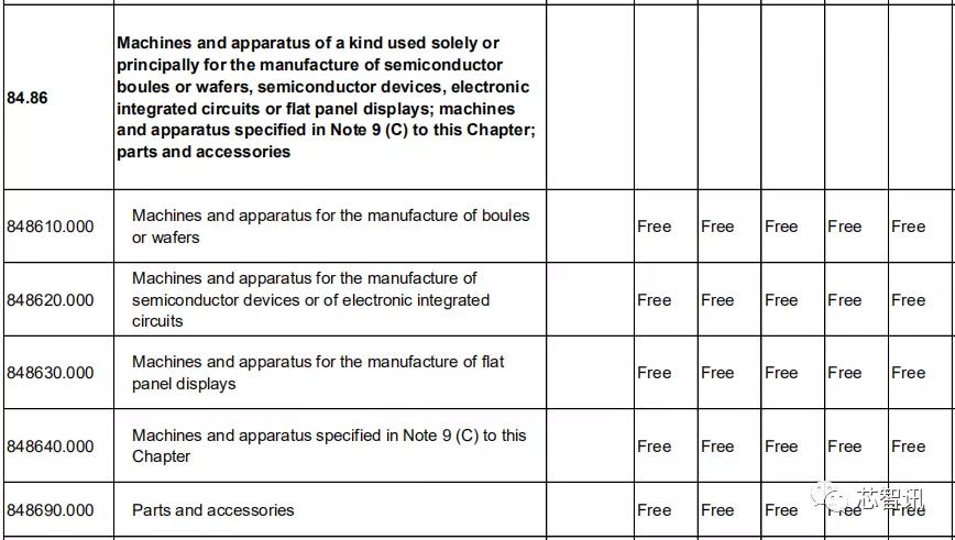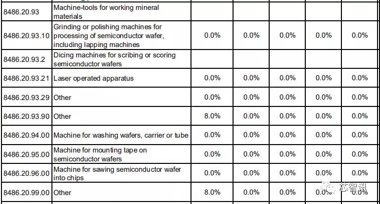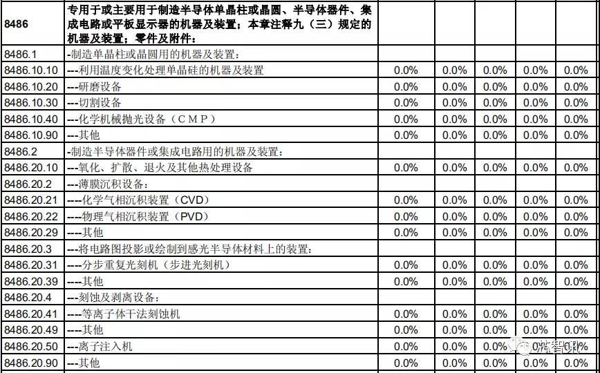 对于专用于或主要用于制造半导体单晶柱或晶圆、半导体器件、集成电路或平板显示器的机器及装置,比如研磨、切割、CMP、氧化、扩散、退火、CVD、PVD、光刻机、离子注入、刻蚀及剥离等众多半导体设备,中国对日本的关税均为0。