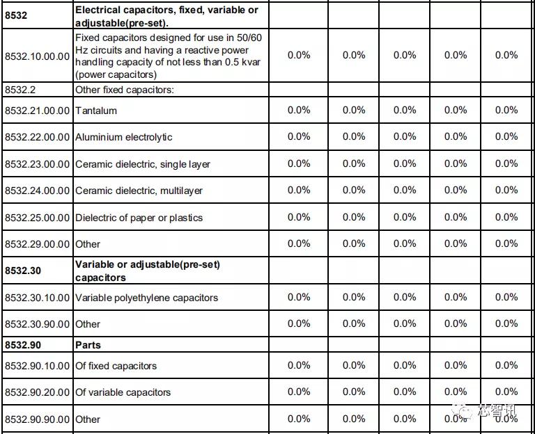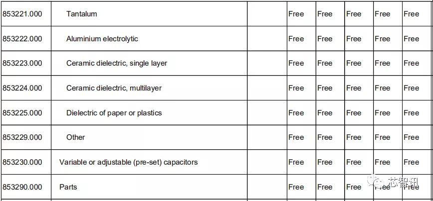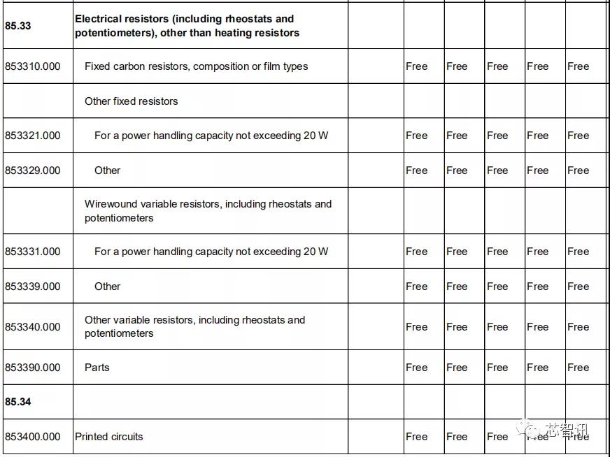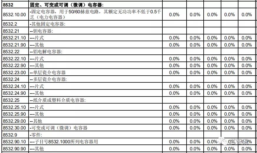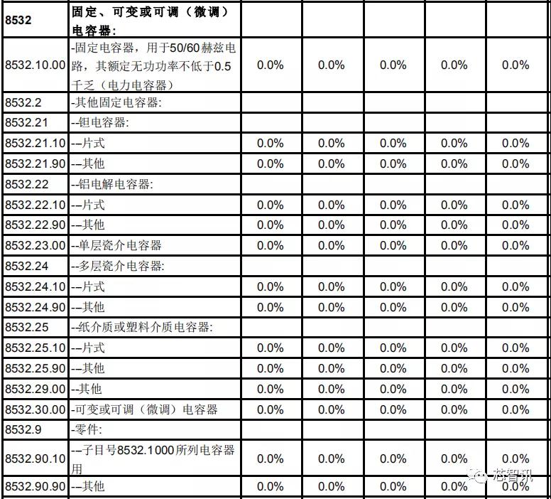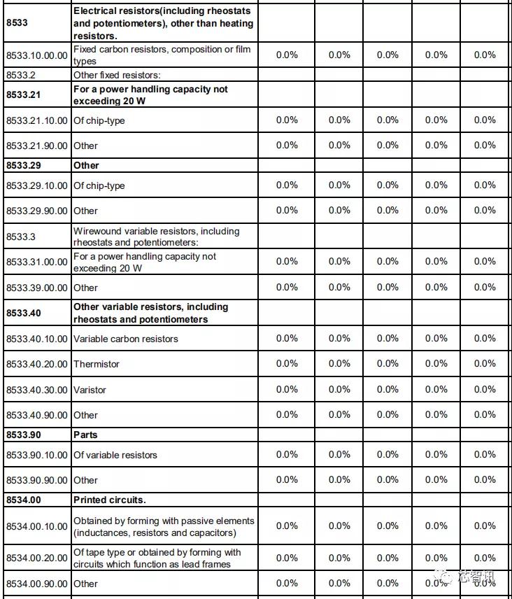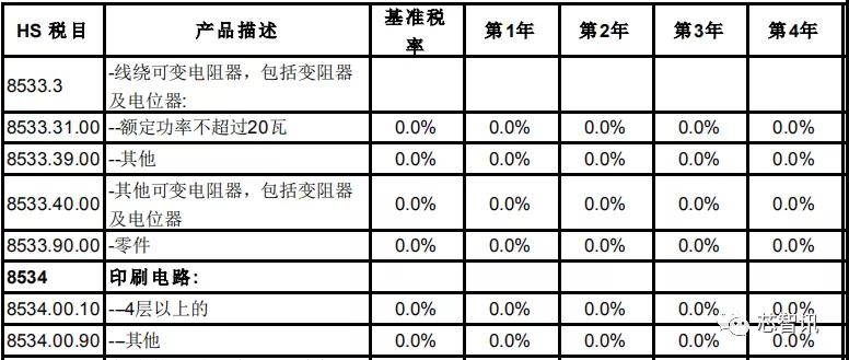 在电阻、电容、印刷电路方面,日本对中国的关税基准税率也都全部保持为0。