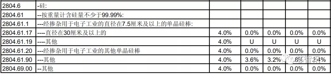 首先在硅材料方面,经掺杂用于电子工业的直径在7.5cm-15.24cm之间单晶硅片基准税率为0。此外,直径30cm以上的单晶硅棒以及经掺杂用于电子工业其他单晶硅棒,基准税率为4%,第一年将直接降至0。