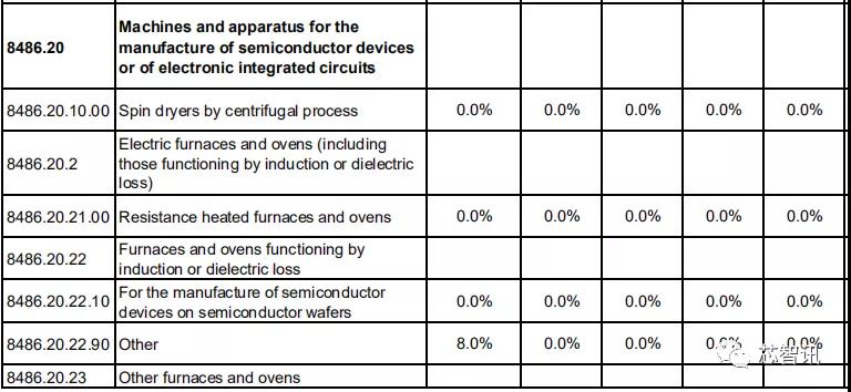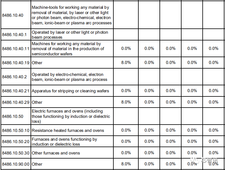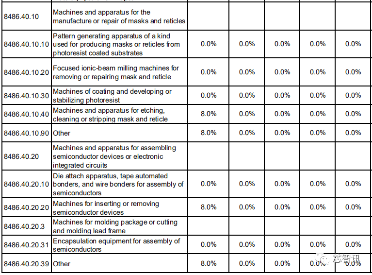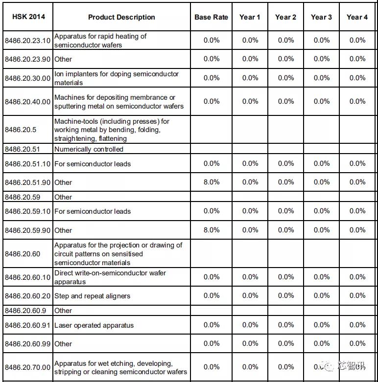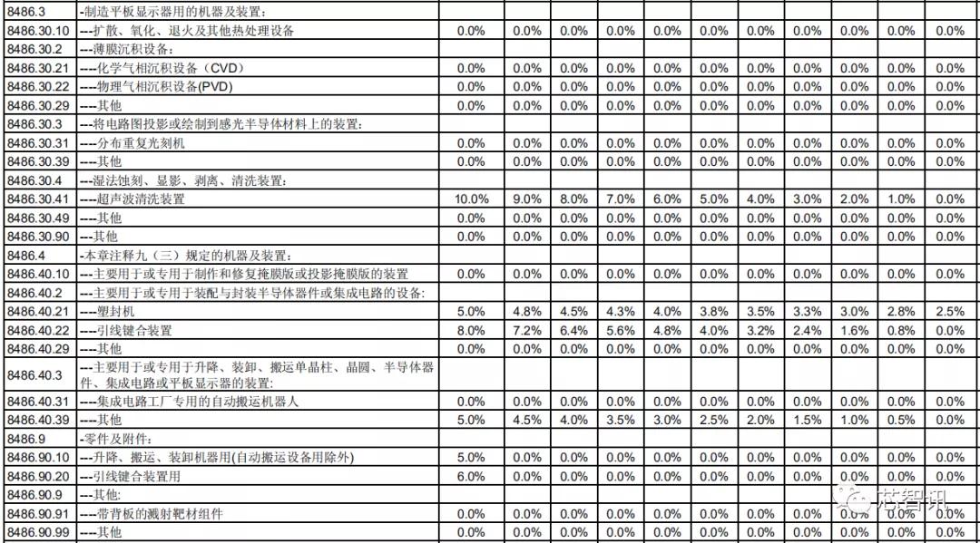 对于主要用于制作和修复掩膜版的设备,以及装配与封装半导体器件或集成电路的设备,虽然有部分设备的基准税率为3%-8%,但是第1年均将直接降至0。