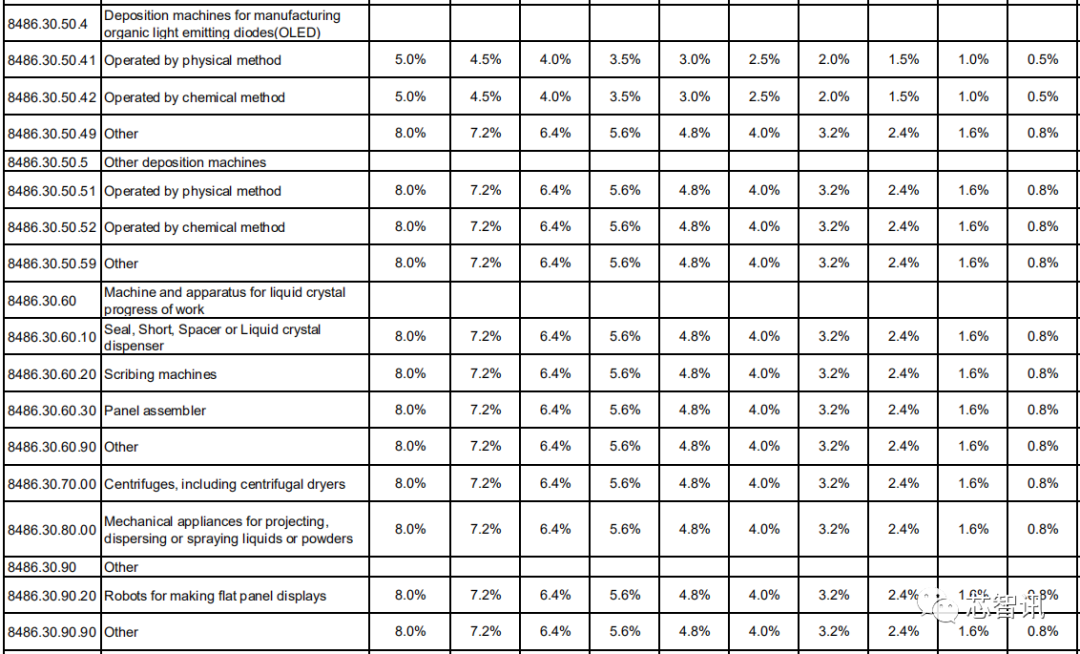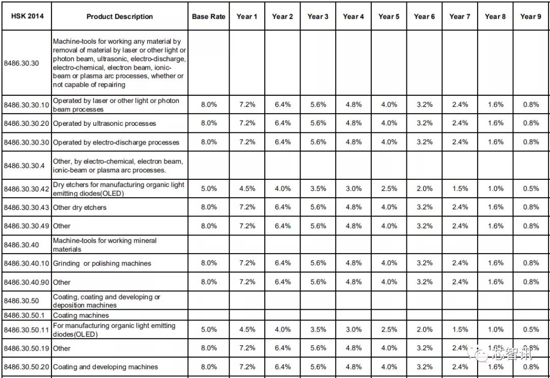 对于各类液晶面板加工设备,基准税率基本都为8%,第1年将降至7.2%,此后逐年降低0.8个百分点,直至第10年降为0。