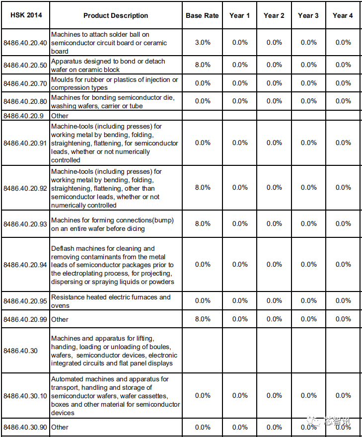 对于专用于或主要用于制造半导体单晶柱或晶圆、半导体器件、集成电路或平板显示器的机器及装置所需的相关零件和附件方面:升降、搬运、装卸机器用(自动搬运设备用除外)的零件和附件的基准税率为5%,第1年直接降为0(日本为第一年降至4.8%,随后逐年递减,直至第21年降为0);引线键合装置用的零件和附件的基准税率为6%,第1年将直接降至0。