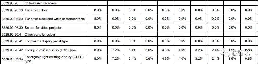 在电视机所需的等离子显示面板方面,韩国对中国的关税基准税率均为8%,第1年直接降至0。LCD和OLED面板方面,韩国对中国的关税基准税率均为8%,第1年均直接降至7.2%,随后逐年降低0.8个百分点,直至第10年降至0。