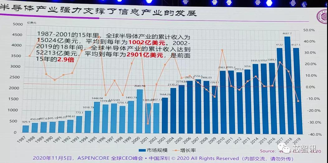 根据历史数据显示,从1987年到2001年的15年里,全球半导体产业的累计收入为15024亿美元,平均到每年为1002亿美元。2002-2019的18年间,全球半导体产业的累计收入达到52213亿美元,平均到每年为2901亿美元,是前面15年的2.9倍,与前面GDP增长的倍数相近,呈强相关性。