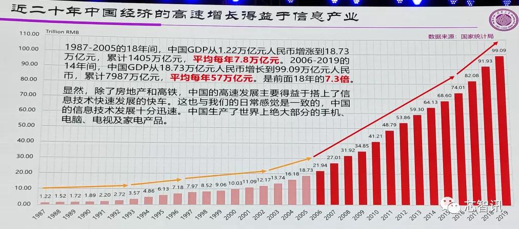 根据统计数据显示,1987- 2005的18年间,中国GDP从1.22万亿元人民币增长到18.73万亿元,累计1405万亿元,平均每年7.8万亿元。2006- 2019的14年间, 中国GDP从18.73万亿元人民币增长到99.09万亿元人民币,累计7987万亿元,平均每年57万亿元,是前面18年的7.3倍。如果把这当中房地产、高铁基建等因素去掉,信息产业贡献的大概也是在3倍多。所以这样的一个数字就证明了,信息产业是中国近20年经济发展的根本动力之一。这也与我们的日常感觉是一致的,中国的信息技术发展十分迅速。中国生产了世界上绝大部分的手机、电脑、电视及家电产品。