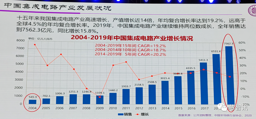 根据数据显示,2004-2019年这十五年来,中国集成电路产业高速增长,产值增长近14倍,年均复合增长率高达19.2%,远高于全球4.5%的年均复合增长率。2019年,中国集成电路产业继续维持两位数成长,全年销售达到7562.3亿元,同比增长15.8%。