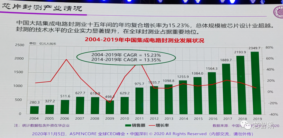 魏少军教授表示:“芯片制造业近年来的增长主要是依靠政府和产业资本的投资,而封测业曾经长期占用我们的绝大部分的江山,但是现在它的比例在下降,而且增速也不高,从2014到2019年,增速在下降,并没有提升。所以这是值得我们关注的现象,说明我们在这个领域的投入是不足的。”