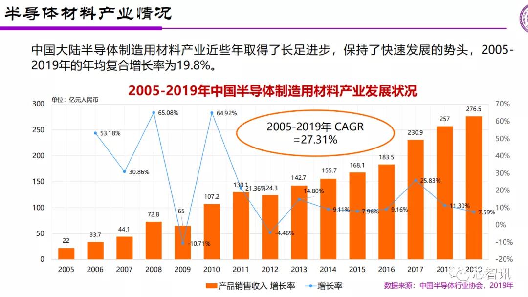在半导体制造所需的半导体材料产业上,近些年中国大陆也取得了长足进步,保持了快速发展的势头,2005-2019年的年均复合增长率为19.8%。但是相比半导体制造产业的24.72%的年复合增长率来说,还是偏低的。