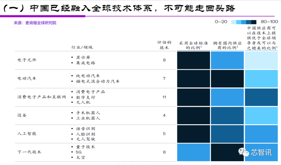 根据麦肯锡全球研究院的一组研究数据显示,在例如电子元件、电动汽车、消费电子及互联网、机器人设备、人工智能、下一代技术等众多关键技术方面,中国对外的依存度依旧很高。从下图当中,我们可以看到,在众多技术方面,中国采用全球标准的比例非常的高,虽然拥有国内供应商的比例也相对较高,但是中国供应商可以在技术上提供全球领导者或可以与之媲美的比例却非常低。这也意味着,很多技术的创新的源头并不在中国,中国需要继续与全球进行技术交流。