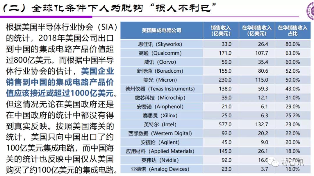 根据美国半导体行业协会公布的数据显示,2018年美国半导体企业在中国的销售的集成电路产品价值超过了1000亿美元,在中国的销售收入在很多美国企业的营收当中占据了半壁江山。显然,在中美科技脱钩的情况下,美国半导体企业并不能从中获益。因此,美国半导体行业协会以及美国很多的半导体企业也反对美国政府与中国脱钩的举措。