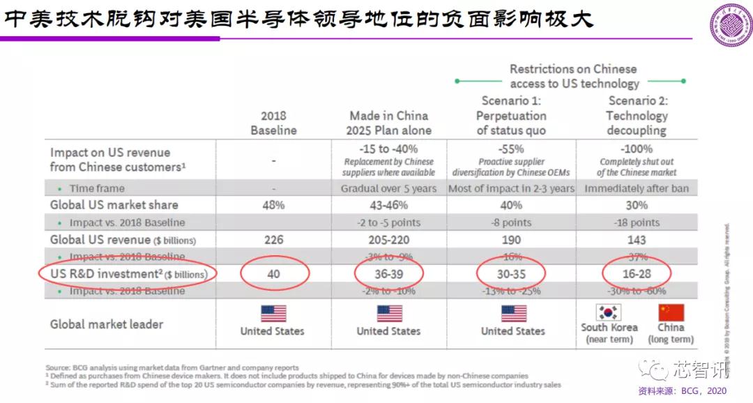 根据美国波士顿咨询集团给美国半导体行业协会做了一份报告显示,在2018年美国没有刻意在技术上限制中国之时,美国半导体企业在全球的市场份额是48%,营收高达2260亿美元,研发投入也达到了400亿美元。但是,当中美技术开始逐步脱钩之后,仅根据中国2025的计划,中国将15-40%的美国供应商替换掉,那么美国半导体企业在全球市场的营收将减少到2050-2200亿美元,市场份额将降至43-46%,由于营收的减少,也将使得美国半导体企业的研发投入减少至360-390亿元。如果中美100%的技术脱钩,那么届时美国半导体企业的全球营收将进一步降至1430亿美元,市场份额降至30%,研发投入也将降至160-280亿美元。美国半导体的领导地位将被大大削弱,被韩国半导体产业所赶超,从长远看可能还将会被中国所赶超。