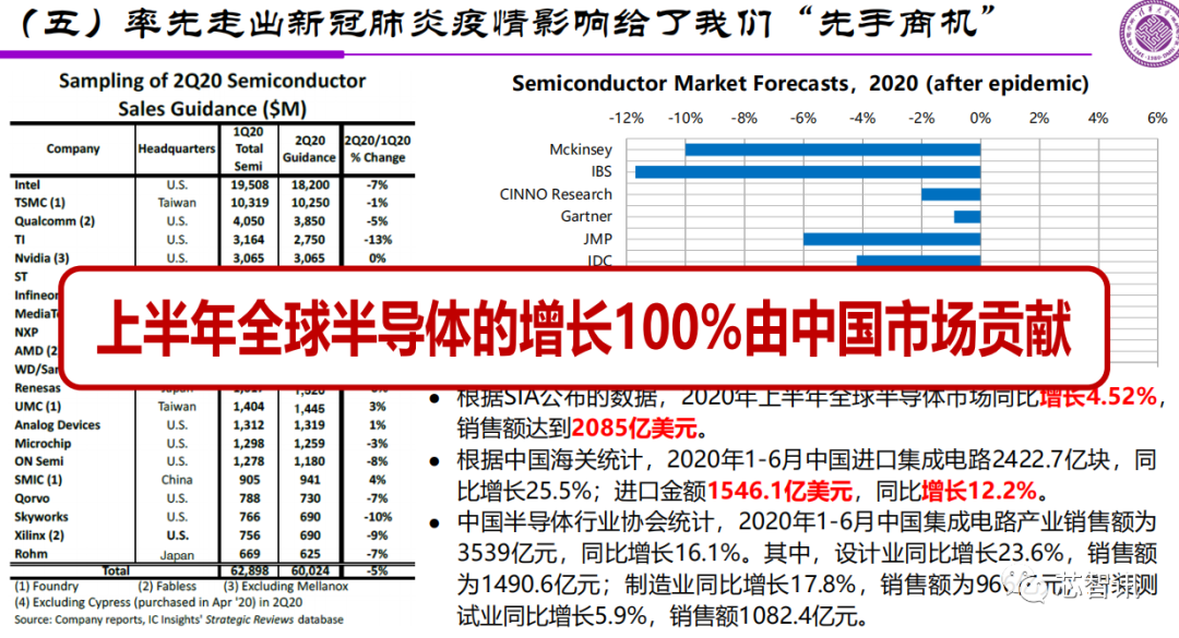 前面提到,受新冠疫情的影响,很多研究机构预测2020年全球半导体市场将出现同比下滑。但是,根据研究机构的预测数据显示,2020年上半年,全球半导体市场同比增长了4.52%,而根据中国的海关数据显示,2020年上半年中国集成电路进口额同比大幅增长了12.2%。根据中国在全球半导体市场的占比来倒推,2020年全球半导体市场的增长,几乎100%是由中国市场贡献的。