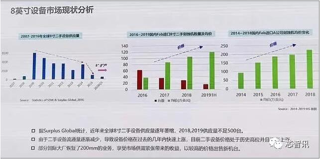 根据Surplus Global统计,近年来全球8英寸二手设备供应量逐年萎缩,2018、2019年供应已不足500台。且二手8吋设备的均价也呈逐年大幅上涨的趋势。而新建一个月产能9万片的8英寸成熟制程工厂,大约需要800台各类设备。