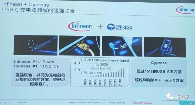 根据英飞凌公布的数据显示,旗下的赛普拉斯拥有超过15年的USB方案经验以及5年的USB Type-C方案经验,是全球第一大USB控制芯片供应商。截至2020年,赛普拉斯已累计出货27亿颗USB控制器芯片。其中,在近几年兴起的USB Type-C市场,赛普拉斯也已累计出货了超过10亿颗USB Type-C控制器。