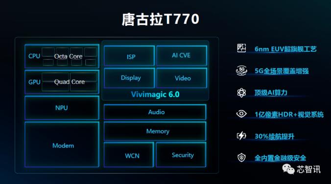 在下一代5G芯片的研发上,2020年2月26日,展锐就发布了其第二代5G手机芯片,同时这也是其首款5G SoC芯片——T7520(已更名唐古拉T770),这也是全球首款基于台积电6nm EUV工艺的芯片,同时集成了相比T710更强的NPU内核,AI算力达到了8TOPS左右。多项指标与联发科今年1月发布的6nm工艺的天玑1200相近。