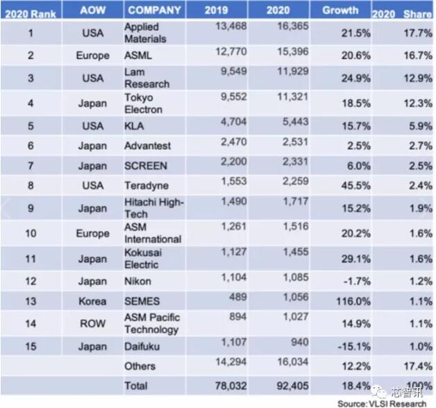 目前在全球半导体设备市场,主要被美国和日本厂商所占据。根据美国半导体产业调查公司VLSI Research的2020年全球TOP15半导体设备厂商销售额排行榜显示,前十五大半导体设备厂分别为:美国应用材料、荷兰ASML、美国泛林集团、日本东京电子、美国科磊、日本爱德万、日本SCREEN、美国泰瑞达(Teradyne)、日本日立高科(Hitachi Higt-Tech)、欧洲ASM International、日本Kokusai Electric、日本尼康、韩国SEMES、中国香港ASM太平洋科技(ASM Pacific Technology)、日本大福(Daifuku)。这十五家厂商占据了全球半导体设备市场82.6%的市场份额。