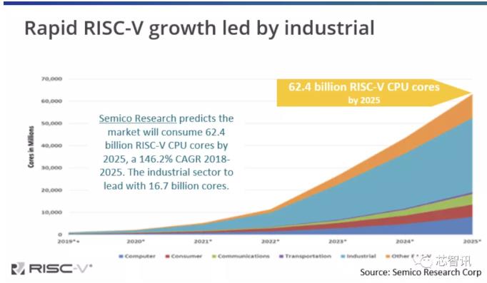根据Semico Research预测,到2025年,RISC-V CPU内核的出货量将达到624亿个,2018-2025年复合年增长率高达146.2%。其中在工业领域将以167亿个核心的出货量居于领先位置。