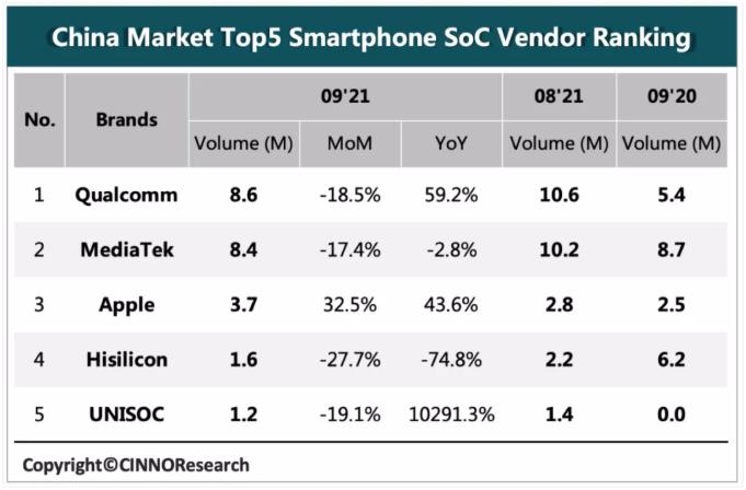 11月2日消息,据市场调研机构CINNO Research的数据显示,紫光展锐在9月以120万颗SoC出货量位列国内智能手机芯片市场出货排名第五,同比实现约103倍的增长。