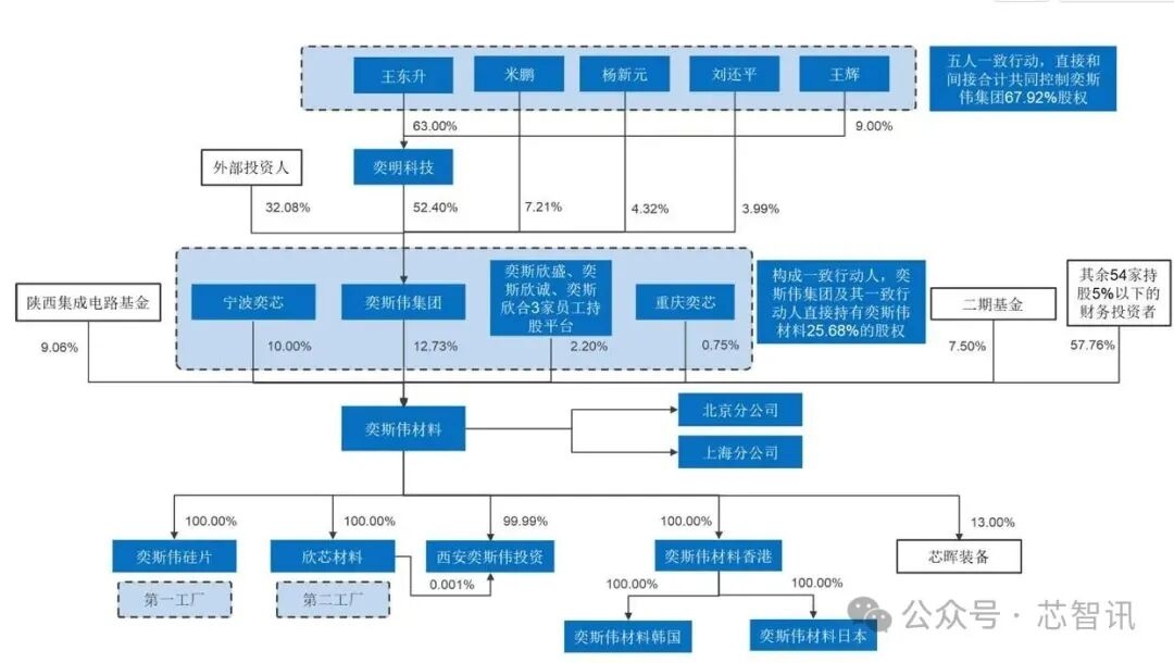 股权结构方面,奕斯伟科技集团、奕行基金、国有控股的陕西省集成电路基金、国有控股的大基金二期、宣岳投资为该公司前五名股东,分别持有其12.73%、10%、9.06%、7.5%、4.03%的股份,其中前四者为大股东。