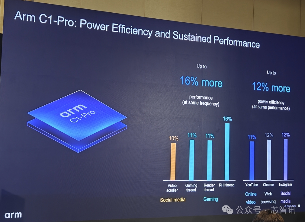 在相关应用测试中,与Cortex-A725相比,C1-Pro CPU在相同主频下,性能最高提升了16%;在相同性能下,功耗降低了12%。