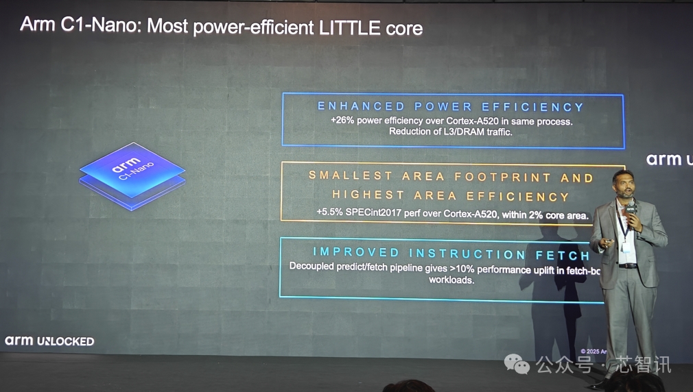 C1-Nano 在最小面积占用的条件下,将 Arm C1 系列 CPU 的优势集于一体。相比此前的Cortex-A520小核,C1-Nano电源效率大幅提高,在同一工艺下,与 Cortex-A520 相比,电源效率提高 26%了;减少 L3/DRAM 交互,实现了最小面积和最高区域效率。与 Cortex-A520 相比,SPECint2017 性能提高 5.5%,核心面积提高 2%;改进了指令获取,解耦预测/获取流水线在获取工作负载方面提高了10%以上的性能。