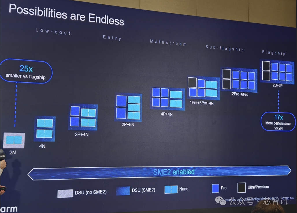 如果拿最低端的2个C1-Nano(基于不支持SME2的DSU)与最高端的2个C1-Ultra + 6个C1-Pro(基于支持SEM2的DSU)对比,后者的性能达到了前者的17倍,不过面积也达到前者的25倍。足见性能、面积跨度之大,还可扩展至各个级别的消费类电子和移动设备,为多样化的端侧工作负载提供不同水平的性能、功耗和面积效率。