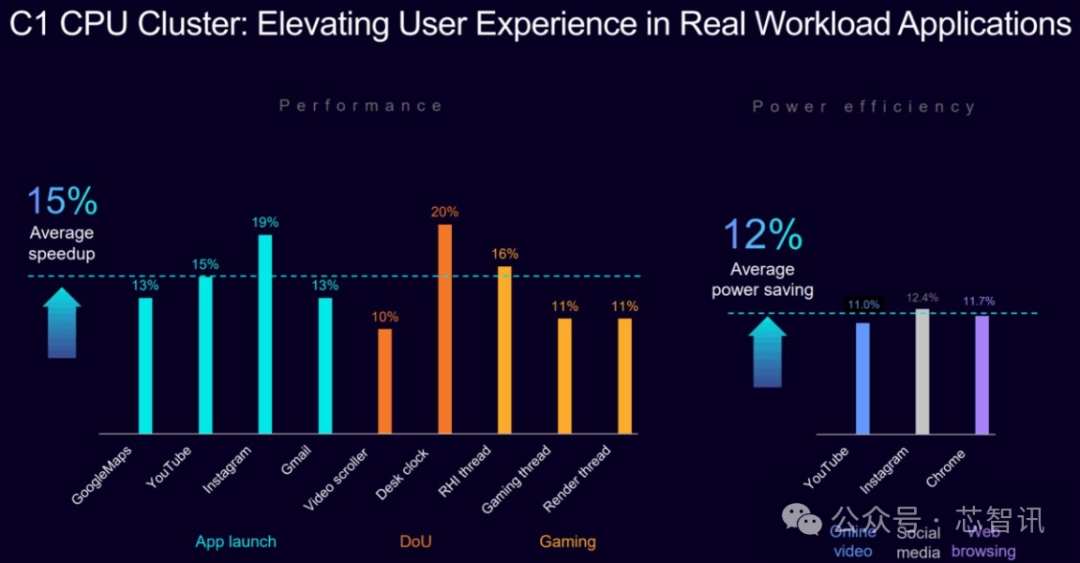 Arm C1 CPU 集群在实际用例中表现突出。在行业领先的性能基准测试,该 CPU 集群在同等条件下,相较于上一代 CPU 集群性能平均提升 30%,在游戏和视频流媒体等应用中平均提速 15%。与此同时,在日常移动端工作负载(如视频播放、社交媒体、网页浏览)中,该 CPU 集群在同等条件下,相较于上一代 CPU 集群功耗平均降低 12%。